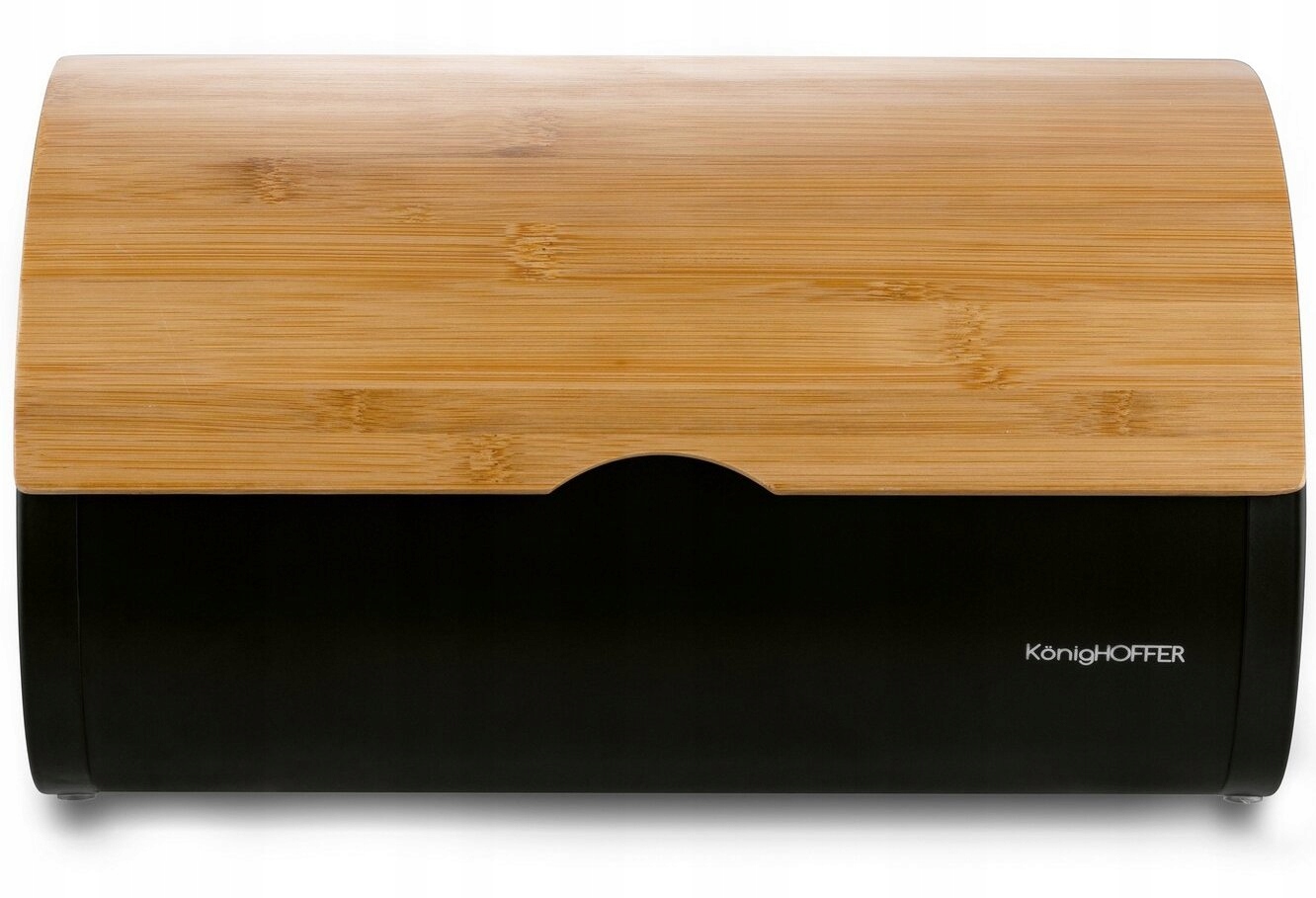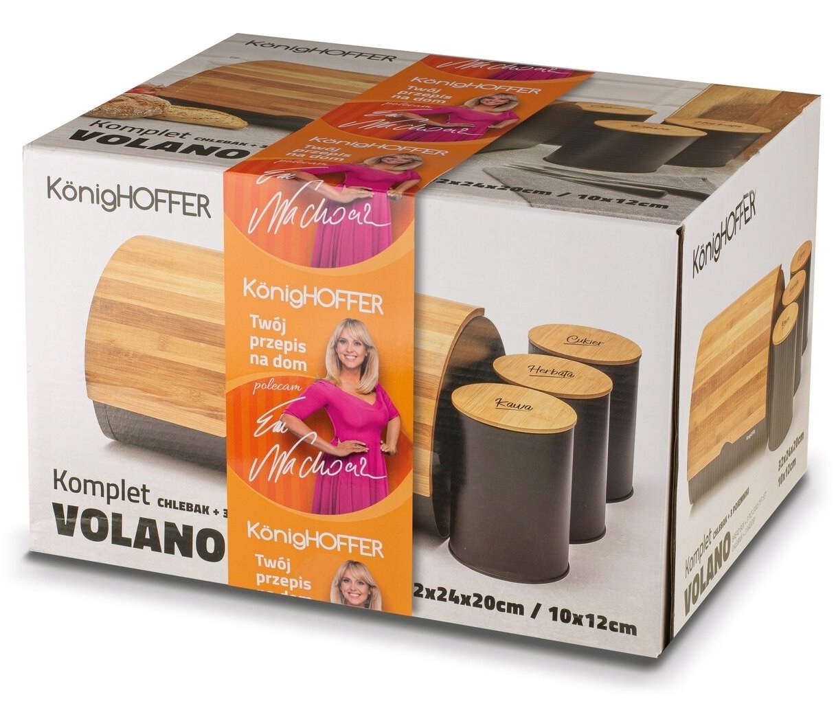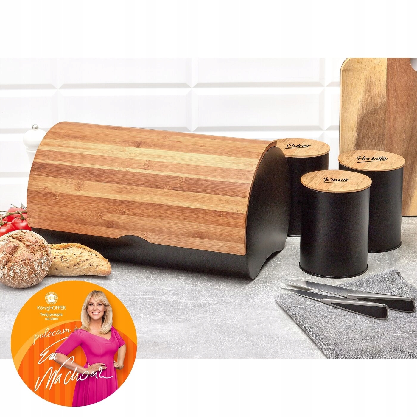 Czarny chlebak metalowy Konighoffer Volano pomaga przedłużyć świeżość pieczywa i pozwala zjeść co rano smaczny chleb, bez konieczności codziennego wychodzenia do sklepu. Dzięki unikatowemu wzornictwu będzie stanowić stylowy element wyposażenia kuchni. Gładkie powierzchnie łatwo utrzymać w czystości. Model ma uchylane zamknięcie mocowane zawiasem. Pokrywa dobrze chroni zawartość przed zanieczyszczeniem i światłem. Pomieści chleb i bułki dla całej rodziny. To propozycja dla tych, którzy cenią sobie świeżość, chrupkość i aromat świeżego pieczywa oraz szukają solidnego, kompaktowego chlebaka. Stabilnie ustawisz go na kuchennym blacie, ponieważ ma antypoślizgowe nóżki z gumy. Metal (stal węglowa) malowany proszkowo i bambus są bardzo trwałe. Wykorzystano je również do stworzenia 3 pojemników na kawę, herbatę i cukier dodanych do zestawu. Dzięki nim zabezpieczysz zawartość puszek kuchennych również przed przypadkowym rozsypaniem. Komplet ma rekomendację Ewy Wachowicz. Jako ambasadorka marki Konighoffer, gorąco i z uśmiechem poleca go ona do domowego użytku. Razem z nim zdobędziesz twój przepis na dom. To jedna z najlepszych opcji w tej kategorii!