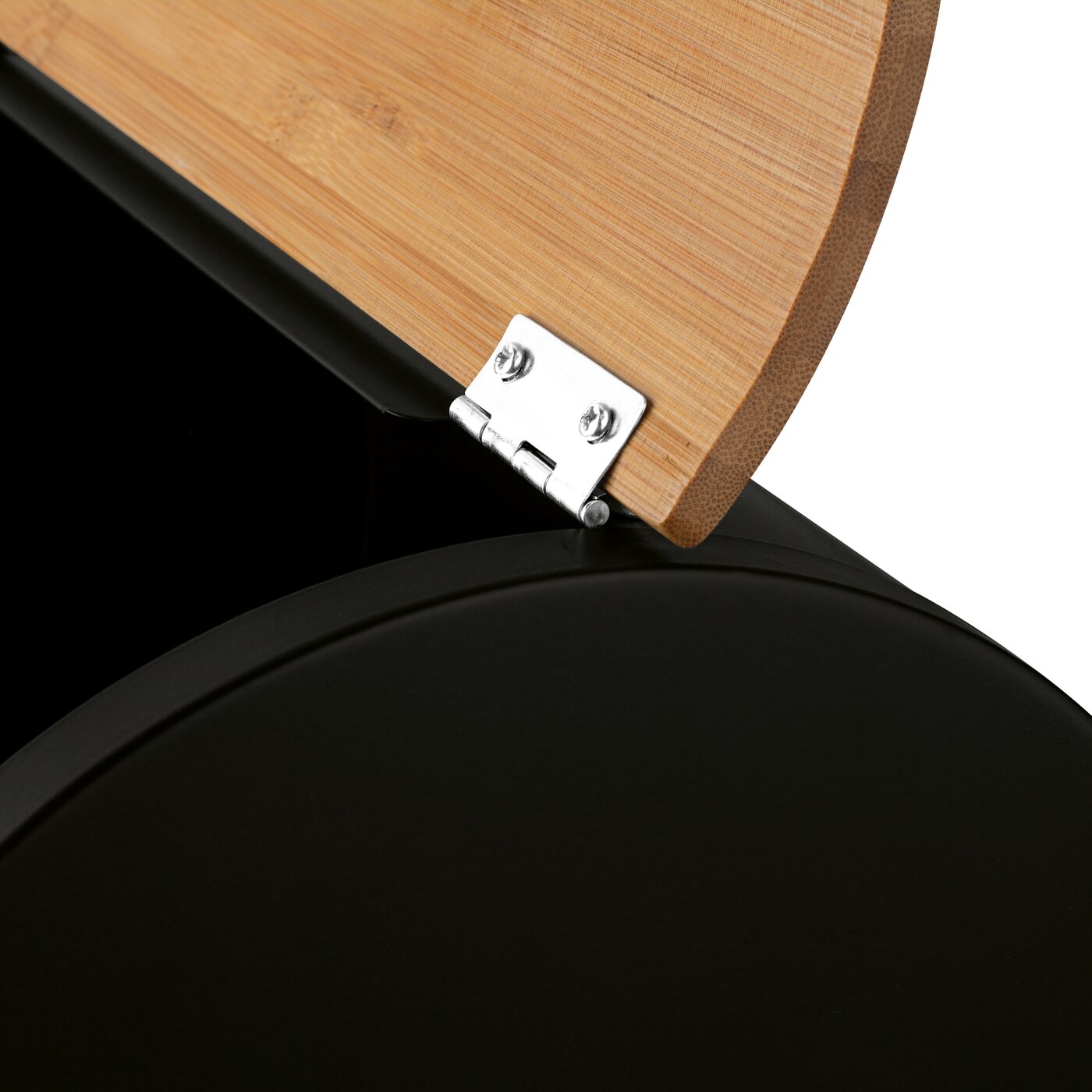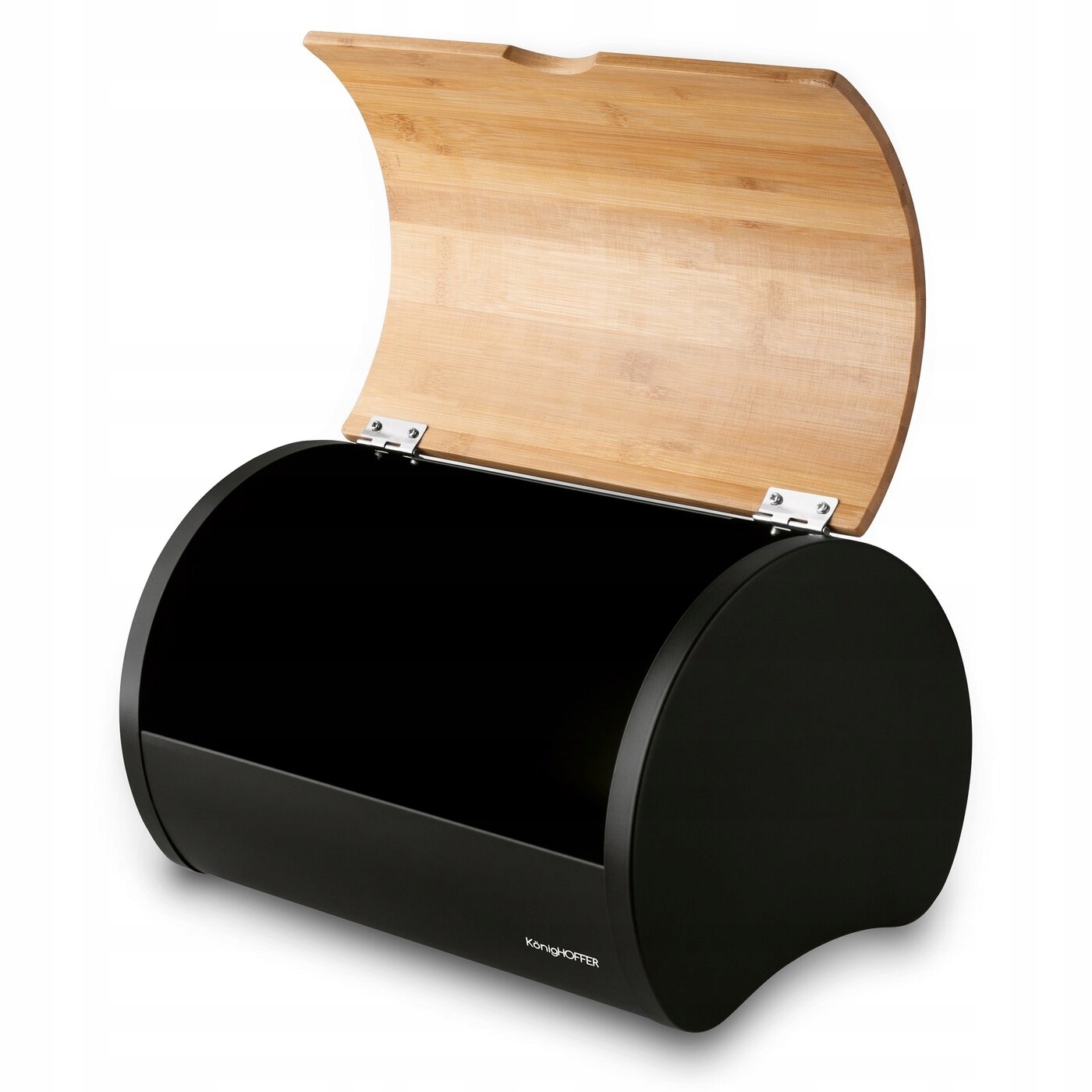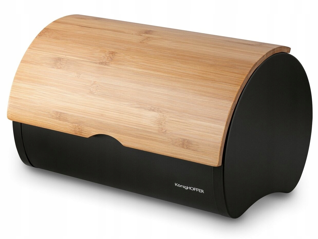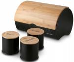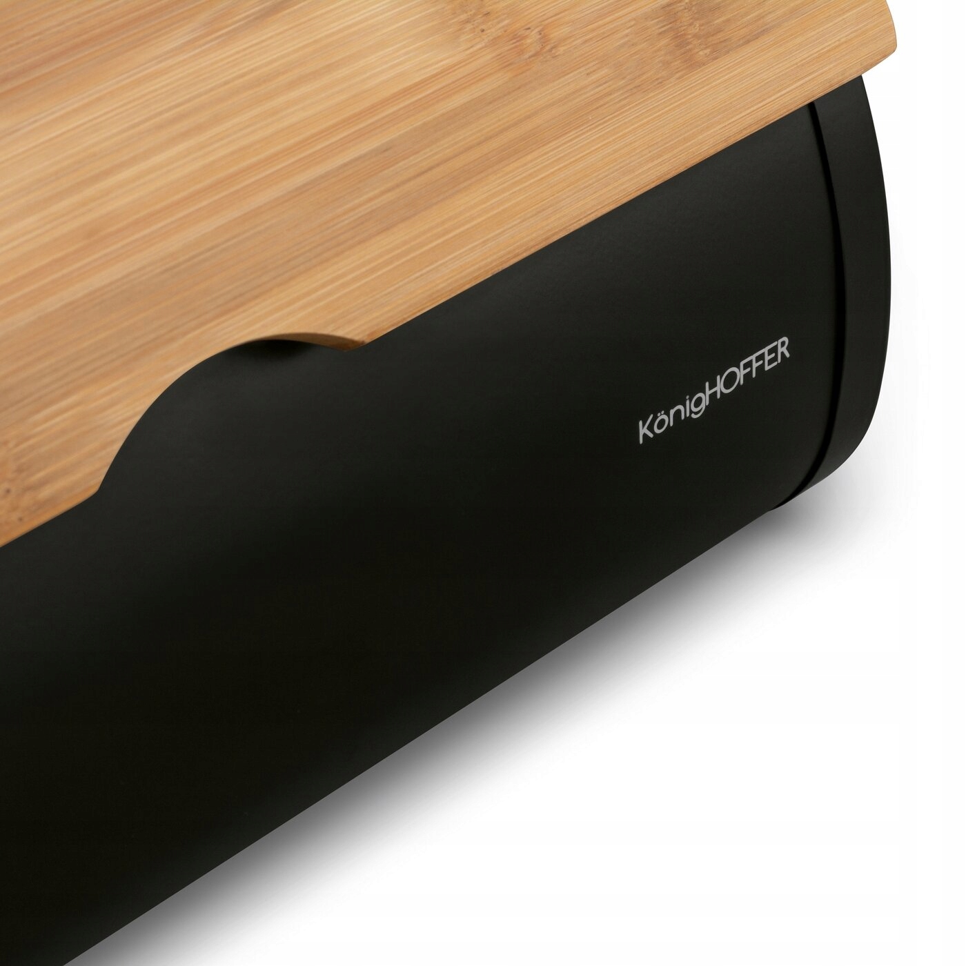 Czarny chlebak metalowy Konighoffer Volano pomaga przedłużyć świeżość pieczywa i pozwala zjeść co rano smaczny chleb, bez konieczności codziennego wychodzenia do sklepu. Dzięki unikatowemu wzornictwu będzie stanowić stylowy element wyposażenia kuchni. Gładkie powierzchnie łatwo utrzymać w czystości. Model ma uchylane zamknięcie mocowane zawiasem. Pokrywa dobrze chroni zawartość przed zanieczyszczeniem i światłem. Pomieści chleb i bułki dla całej rodziny. To propozycja dla tych, którzy cenią sobie świeżość, chrupkość i aromat świeżego pieczywa oraz szukają solidnego, kompaktowego chlebaka. Stabilnie ustawisz go na kuchennym blacie, ponieważ ma antypoślizgowe nóżki z gumy. Metal (stal węglowa) malowany proszkowo i bambus są bardzo trwałe. Wykorzystano je również do stworzenia 3 pojemników na kawę, herbatę i cukier dodanych do zestawu. Dzięki nim zabezpieczysz zawartość puszek kuchennych również przed przypadkowym rozsypaniem. Komplet ma rekomendację Ewy Wachowicz. Jako ambasadorka marki Konighoffer, gorąco i z uśmiechem poleca go ona do domowego użytku. Razem z nim zdobędziesz twój przepis na dom. To jedna z najlepszych opcji w tej kategorii!