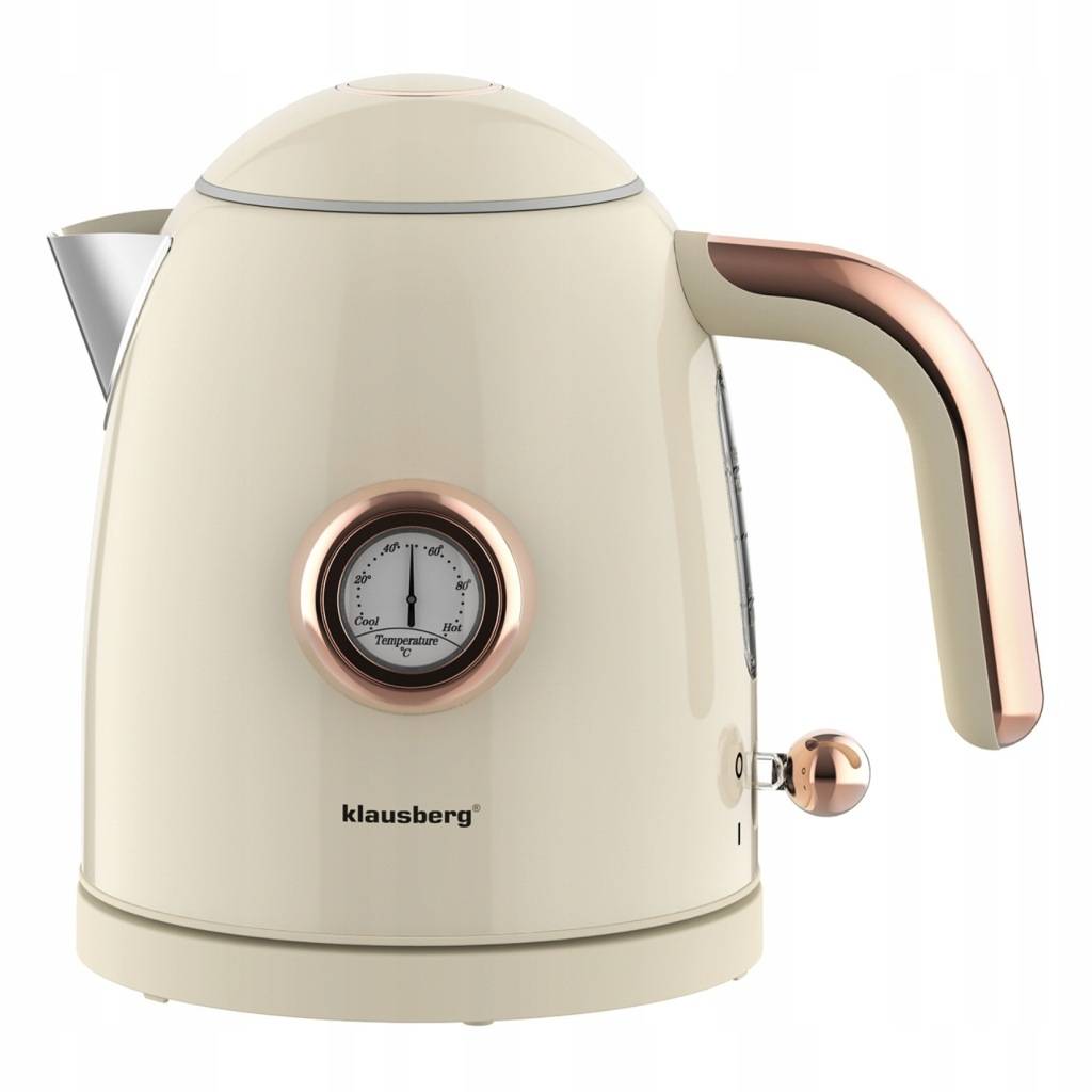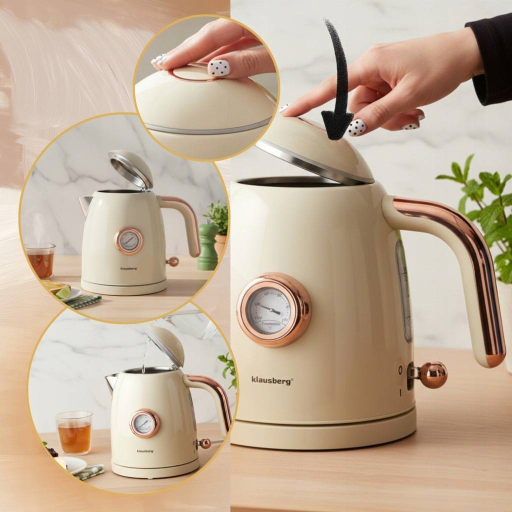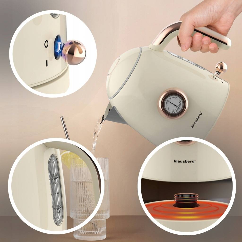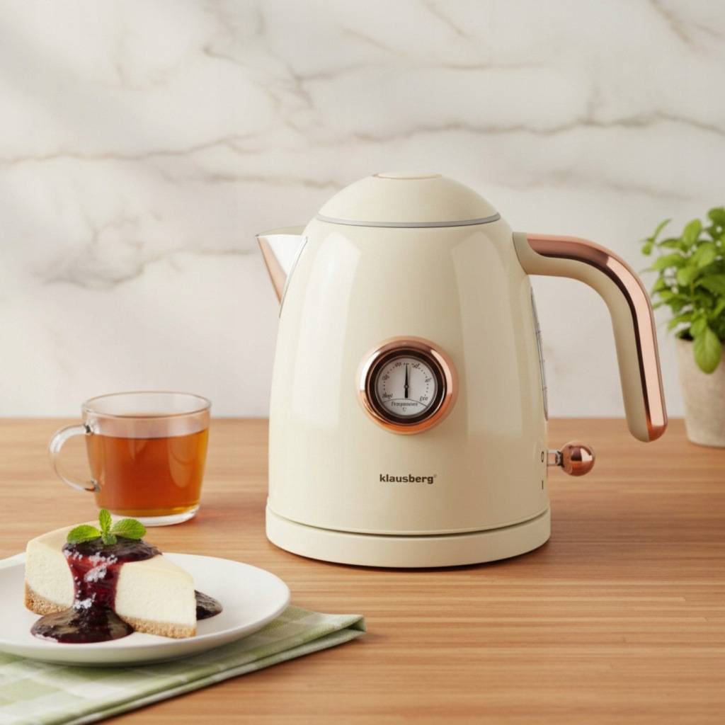 Model KLAUSBERG KB-9018 to elegancki czajnik elektryczny w stylu retro, który wyróżnia się kremową obudową i złotymi detalami ✨