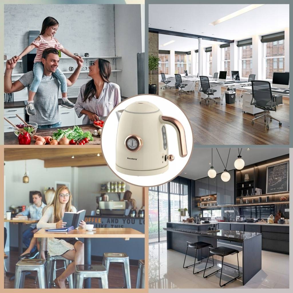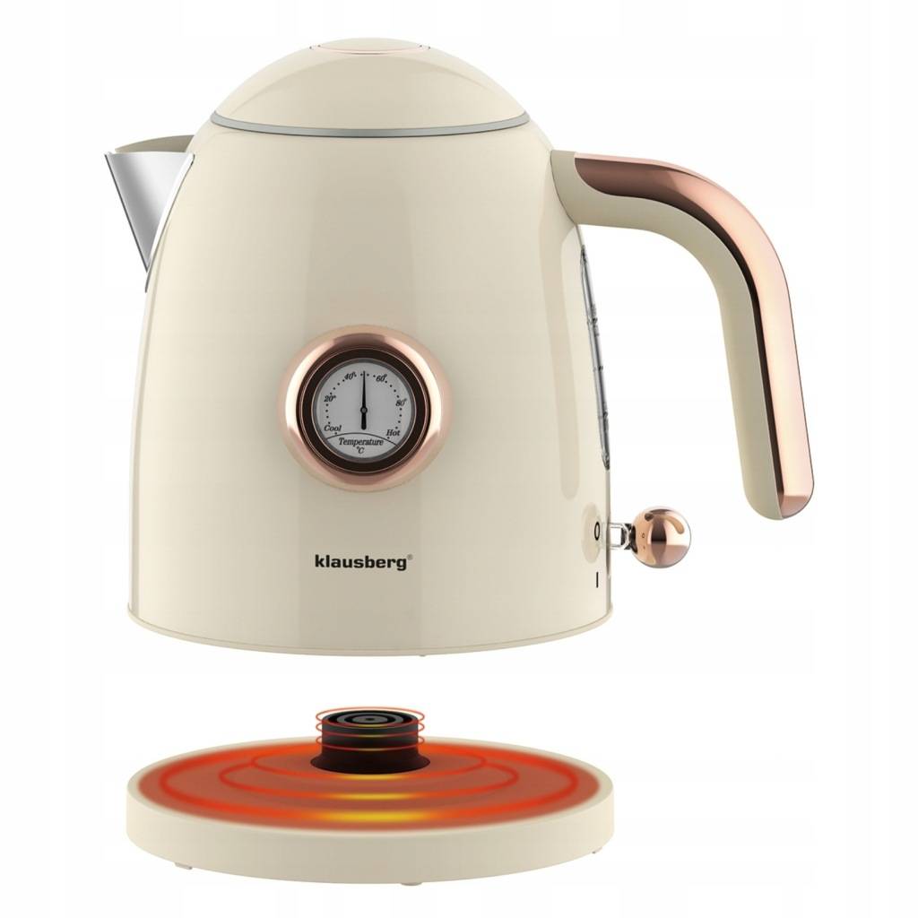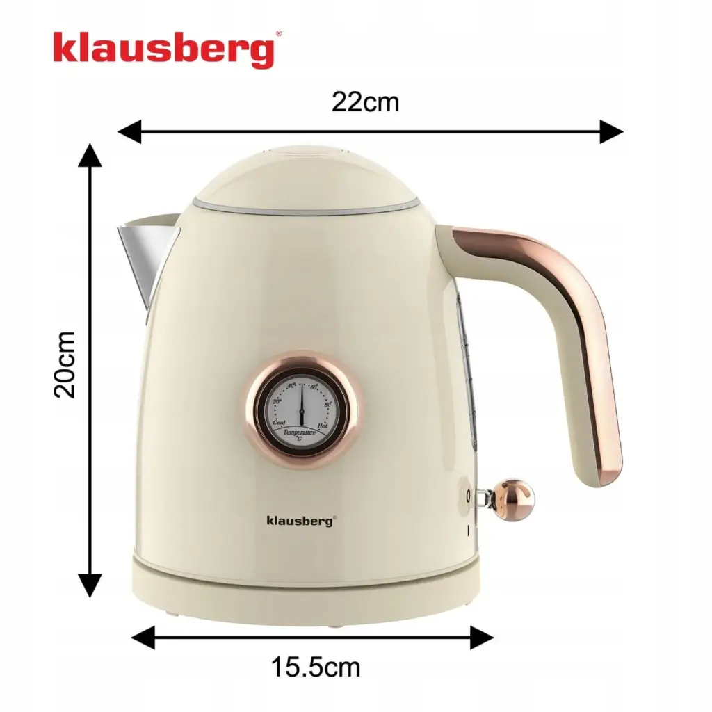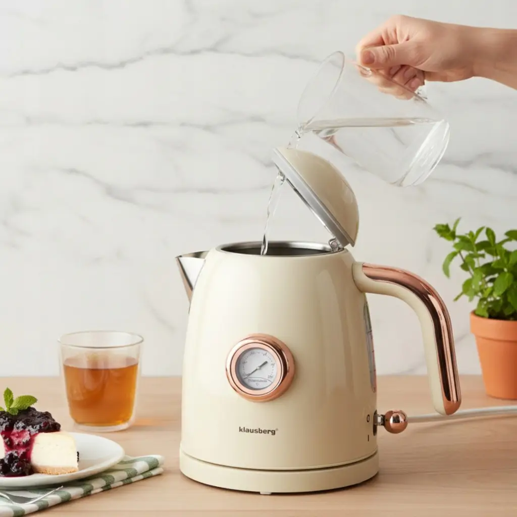 Model KLAUSBERG KB-9018 to elegancki czajnik elektryczny w stylu retro, który wyróżnia się kremową obudową i złotymi detalami ✨