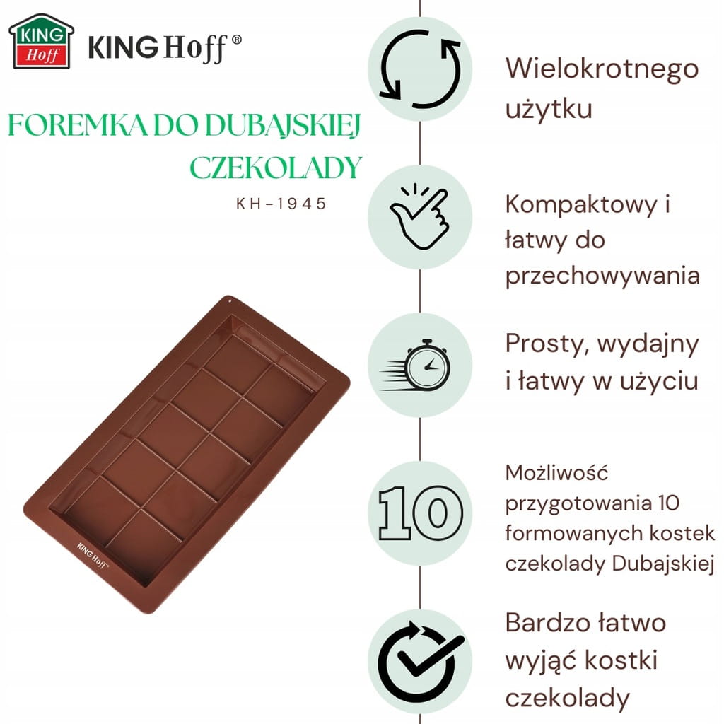 Zaprojektowana z myślą o pasjonatach domowych słodkości. Dzięki silikonowej foremce KINGHoff KH-1945 przygotujesz perfekcyjnie uformowane kostki luksusowej, dubajskiej czekolady – z orzechami, bakaliami, nadzieniem lub na czysto.